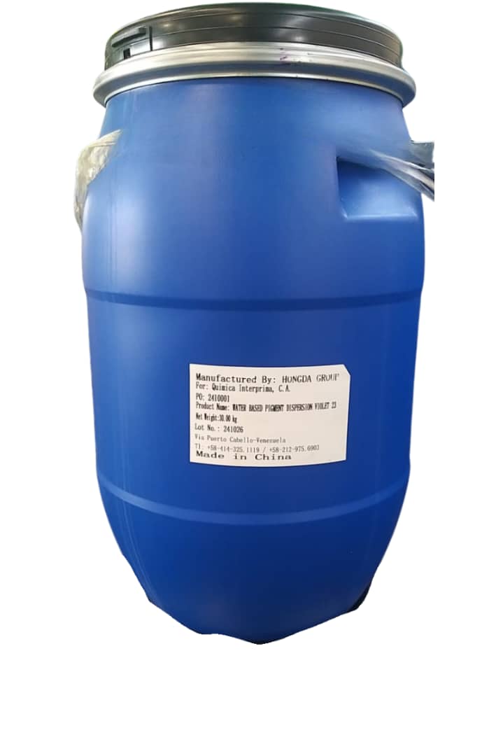 El Water based dispersion pigment VIOLET-23 es una dispersión acuosa de un pigmento orgánico conocido como dioxazina violeta. Este pigmento se distingue por su tono violeta azulado intenso y brillante, además de ofrecer una excelente resistencia a la luz y a la intemperie. Al igual que los otros pigmentos de dispersión acuosa, se presenta como partículas finas del pigmento violeta dispersas de manera estable en agua con la ayuda de agentes dispersantes. Su alta fuerza de color permite obtener tonos violetas profundos incluso con bajas concentraciones.